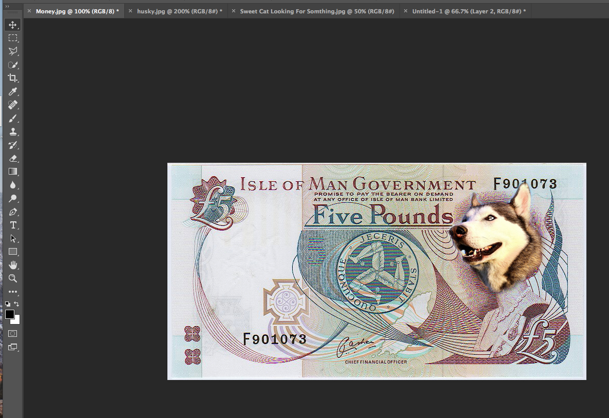 I added a Husky onto a five pound note with photoshop and used the polygonal lasso tool to cut around the picture of the husky and I copied and pasted it onto the five pound note.